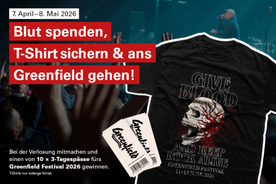 Gewinne mit etwas Glück einen von 10 × 3-Tagespässen fürs Greenfield Festival 2026 in Interlaken vom 11.–13. Juni 2026! So nimmst du teil: Formular ausfüllen im Blutspendezentrum oder an einer mobilen Blutspendeaktion oder online teilnehmen.