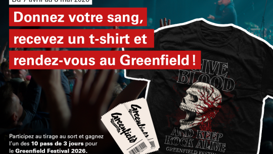 Venez donner votre sang et récupérez votre t-shirt exclusif directement sur place. Jusqu'au 8 mai, participez au tirage au sort pour gagner l'un des 10 pass de 3 jours pour le Greenfield.